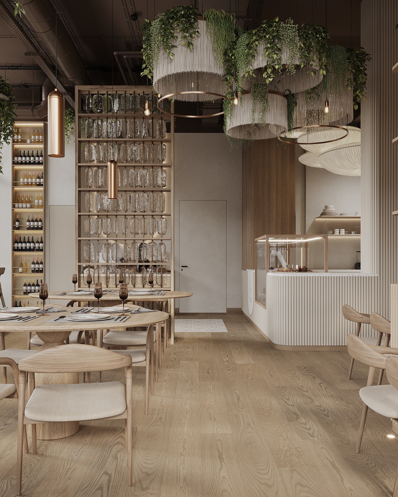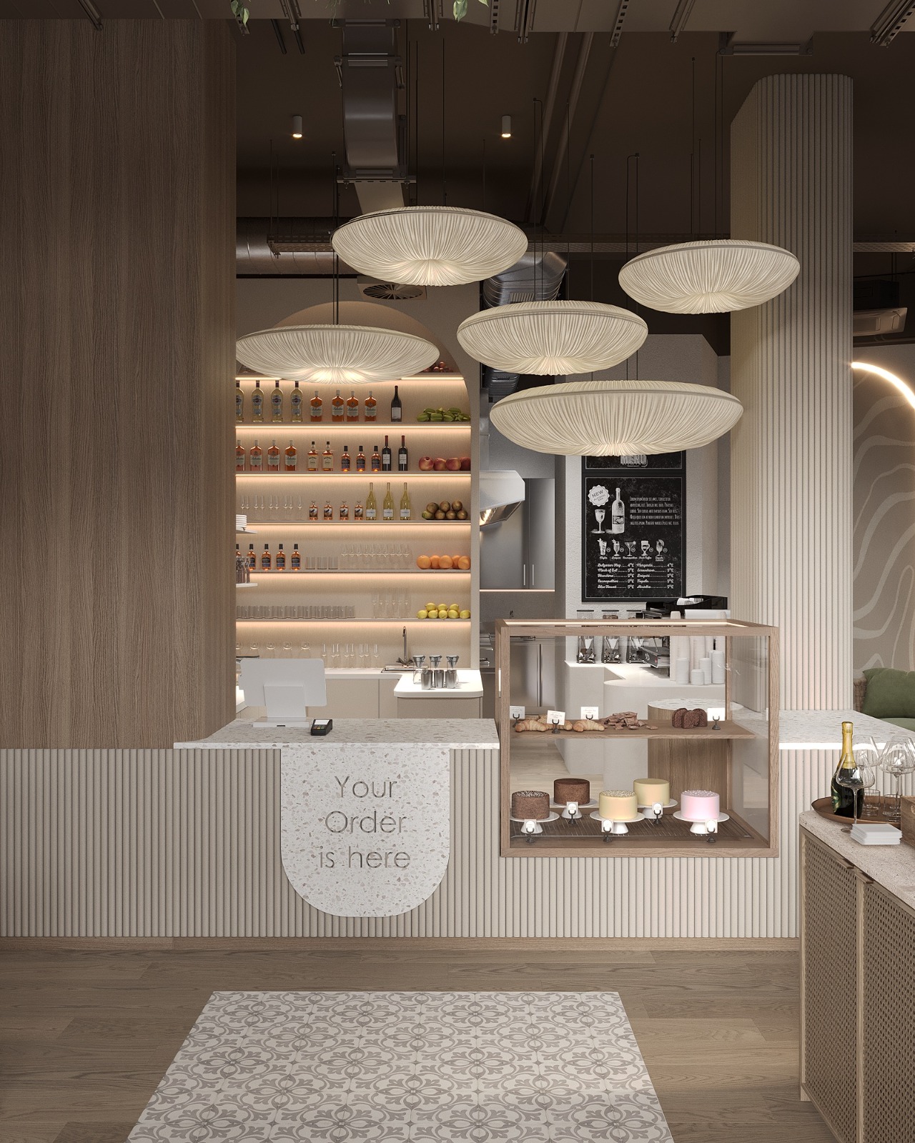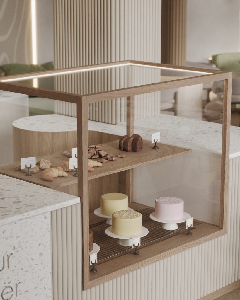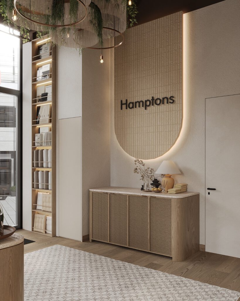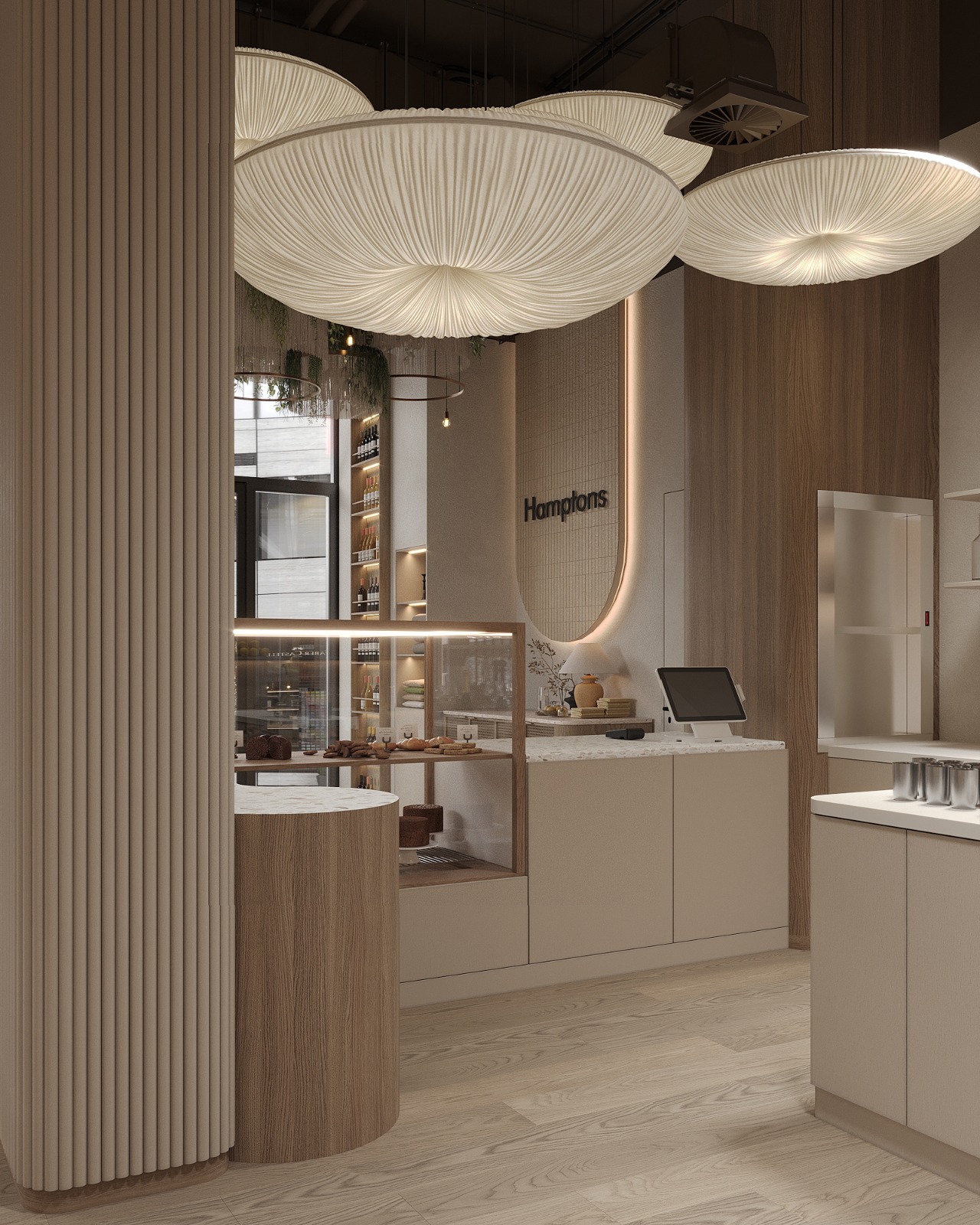 Das Interior des Café Hamptons verbindet warme Naturmaterialien mit einer klaren, modernen Formsprache. Helles Holz, sanfte Beige‑ und Cremetöne sowie dezente schwarze Akzente schaffen eine ruhige, einladende Atmosphäre. Die offene Theke mit ihren strukturierten Holzfronten bildet das Herzstück des Raumes und setzt die frischen Backwaren wirkungsvoll in Szene. Großzügige Lichtflächen und harmonisch abgestimmte Materialien verleihen dem Café eine freundliche, luftige Wirkung, die zum Verweilen einlädt – ob für einen schnellen Kaffee oder einen entspannten Brunch.